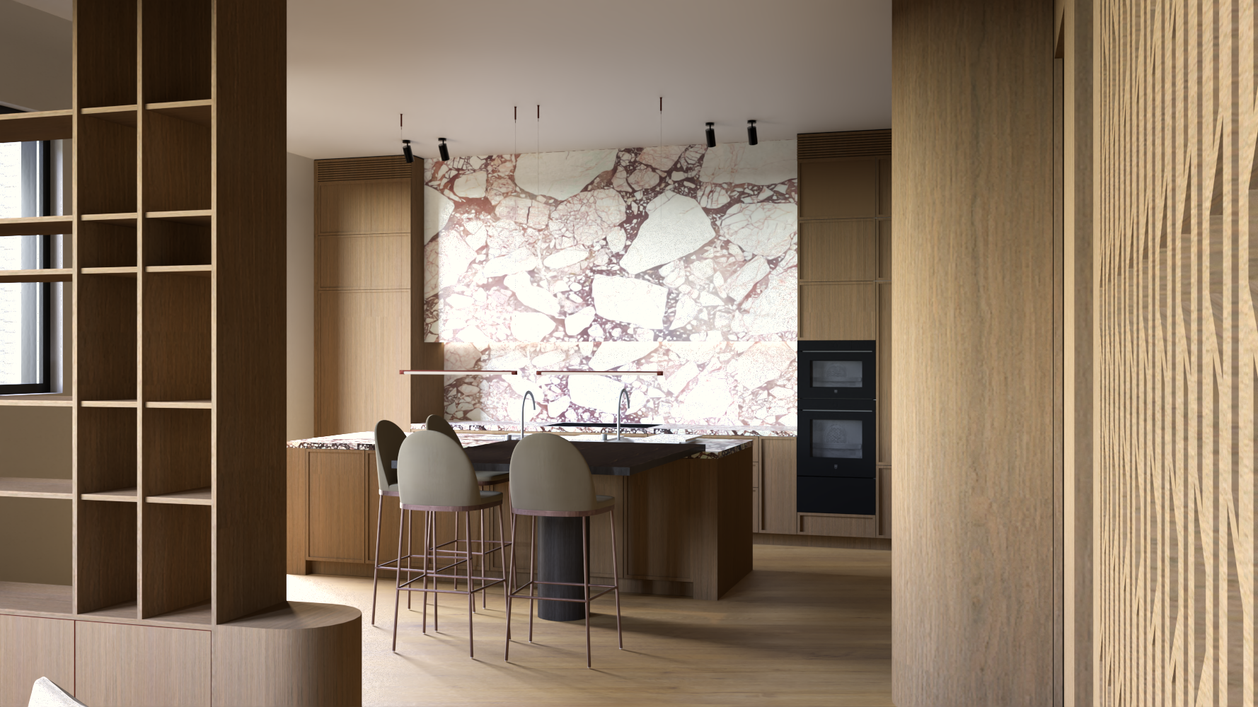 Designed as a tranquil retreat for its semi-retired owners, the apartment reflects their style through layered materiality and a colour palette drawn from treasured artworks. The space is open yet carefully balances public and private realms. At its heart, a sculptural staircase announces arrival while providing a quietly functional element for daily life. Feature marble and warm timber are layered throughout, with gentle curves in both fixed and freestanding pieces providing contrast to the home’s sharp geometry. Downstairs, the house offers varied experiences for entertaining, set against a backdrop of panoramic views. Upstairs, a private retreat provides spaces to reflect, work and unwind, where the considered material choices foster a sense of refuge and intimacy.