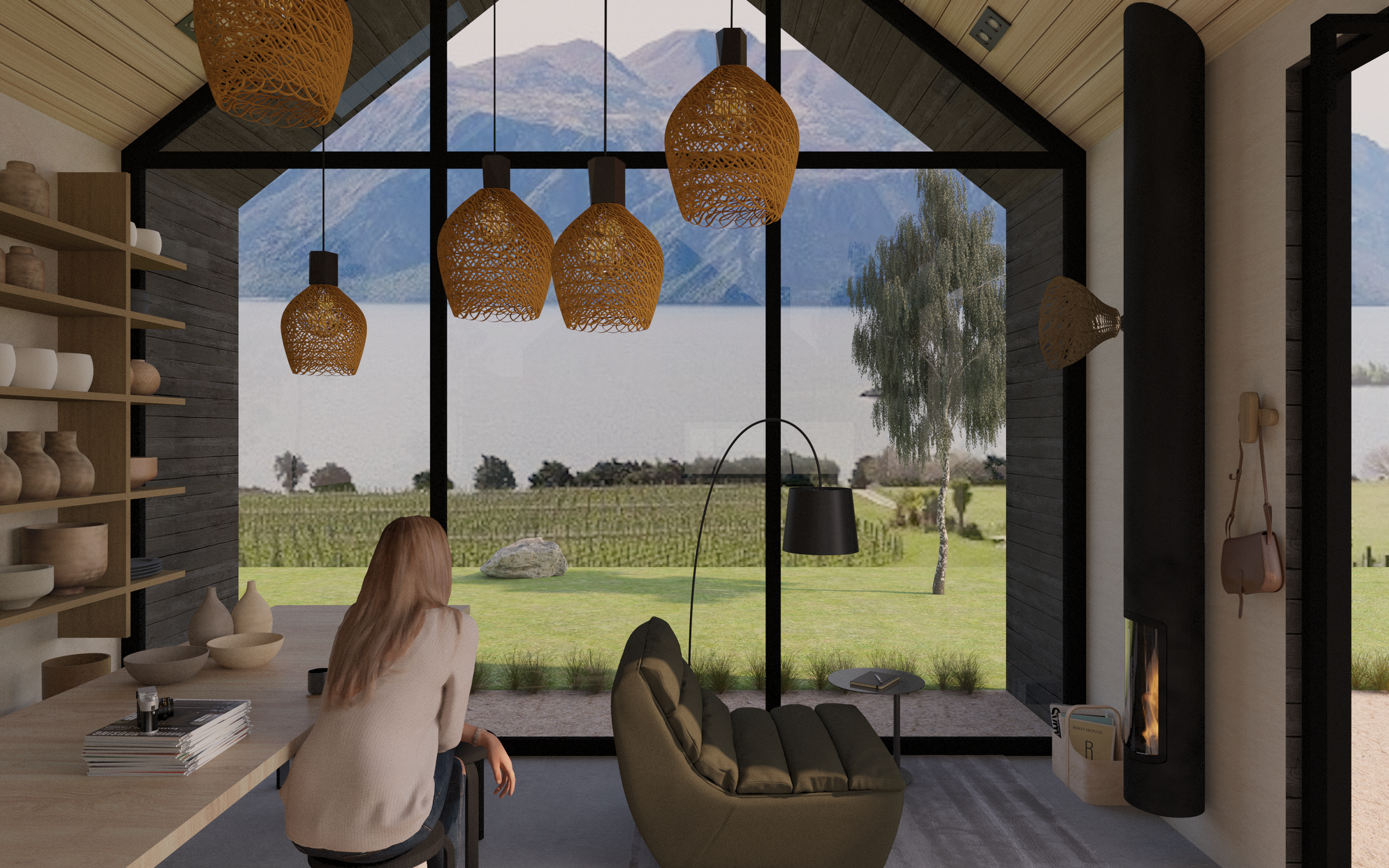 Mahi uku is a quiet ceramic studio, designed as a separate structure within the property to provide a creative workspace. Barn-inspired in form, the studio features floor-to-ceiling picture windows that frame expansive views of the lake and surrounding mountains, drawing natural light deep into the space and reinforcing its connection to the landscape. Materiality echoes the tones of the surrounding land, with a hero rammed earth wall anchoring the interior. Natural stone, leather accents, and stainless-steel benchtops provide both durability and tactility, supporting the functional demands of the studio while maintaining a refined aesthetic. Robust yet warm, the palette balances practicality with atmosphere, allowing the studio to function seamlessly as a place for making as well as a space for reflection and inspiration.