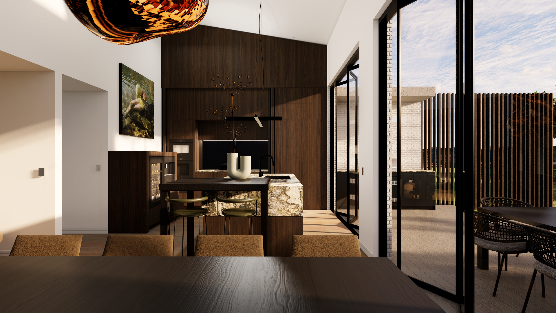 A thoughtfully crafted design creates a seamless connection between the kitchen, dining and living areas, forming the heart of the home. A balance of minimalist refinement and warm European elegance creates a welcoming environment for both the client and guests, still respecting the home’s architectural heritage. The kitchen can subtly disappear behind bifold doors, quietly transforming the space and concealing everyday clutter and the central island bench provides a natural gathering point. Textured materials in nature’s moody hues bring depth and warmth to a muted palette, layering walnut and black-stained timber, forest-inspired stone, and tobacco-toned leathers with tactile fabrics. Existing natural light is enriched by subtle lighting treatments that create atmosphere throughout the day and evening.